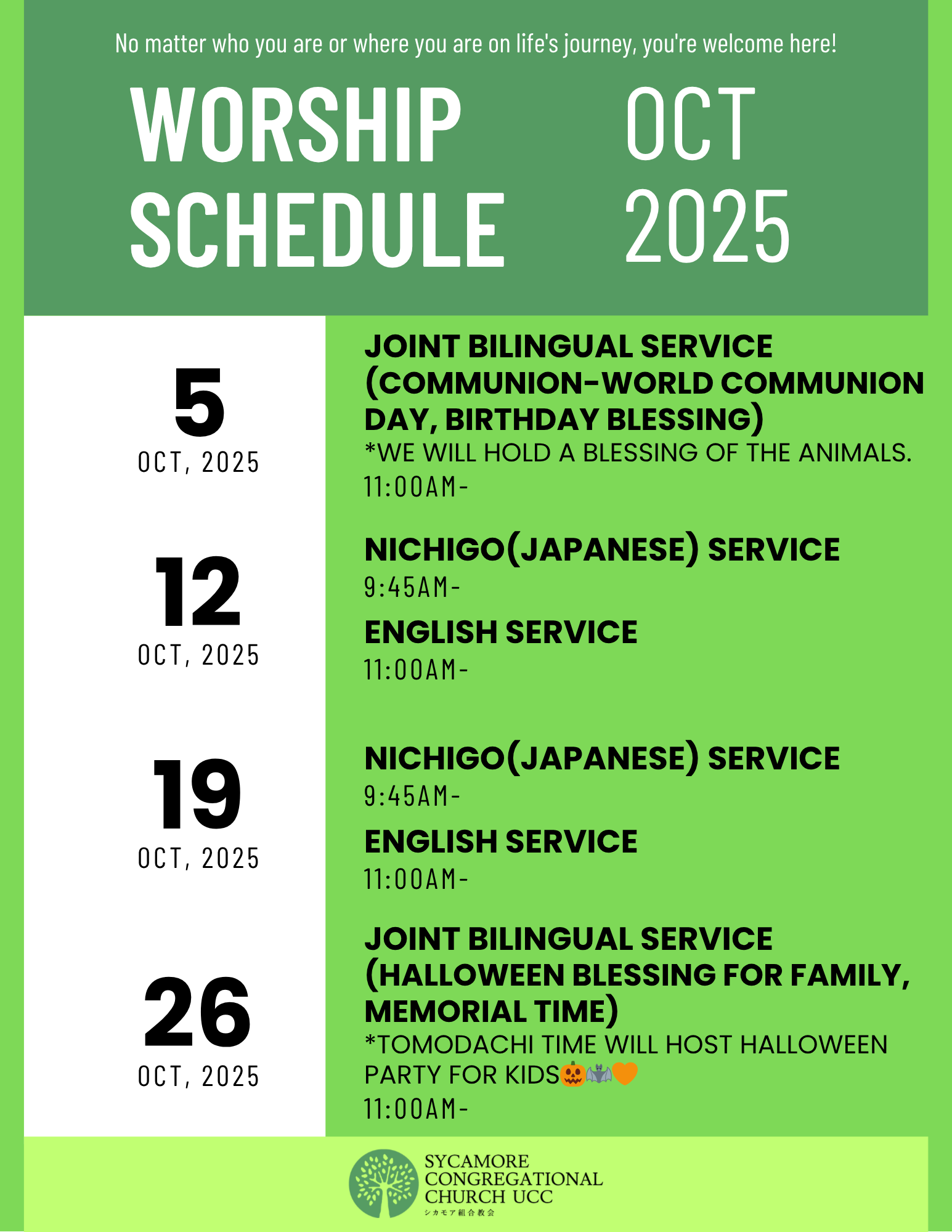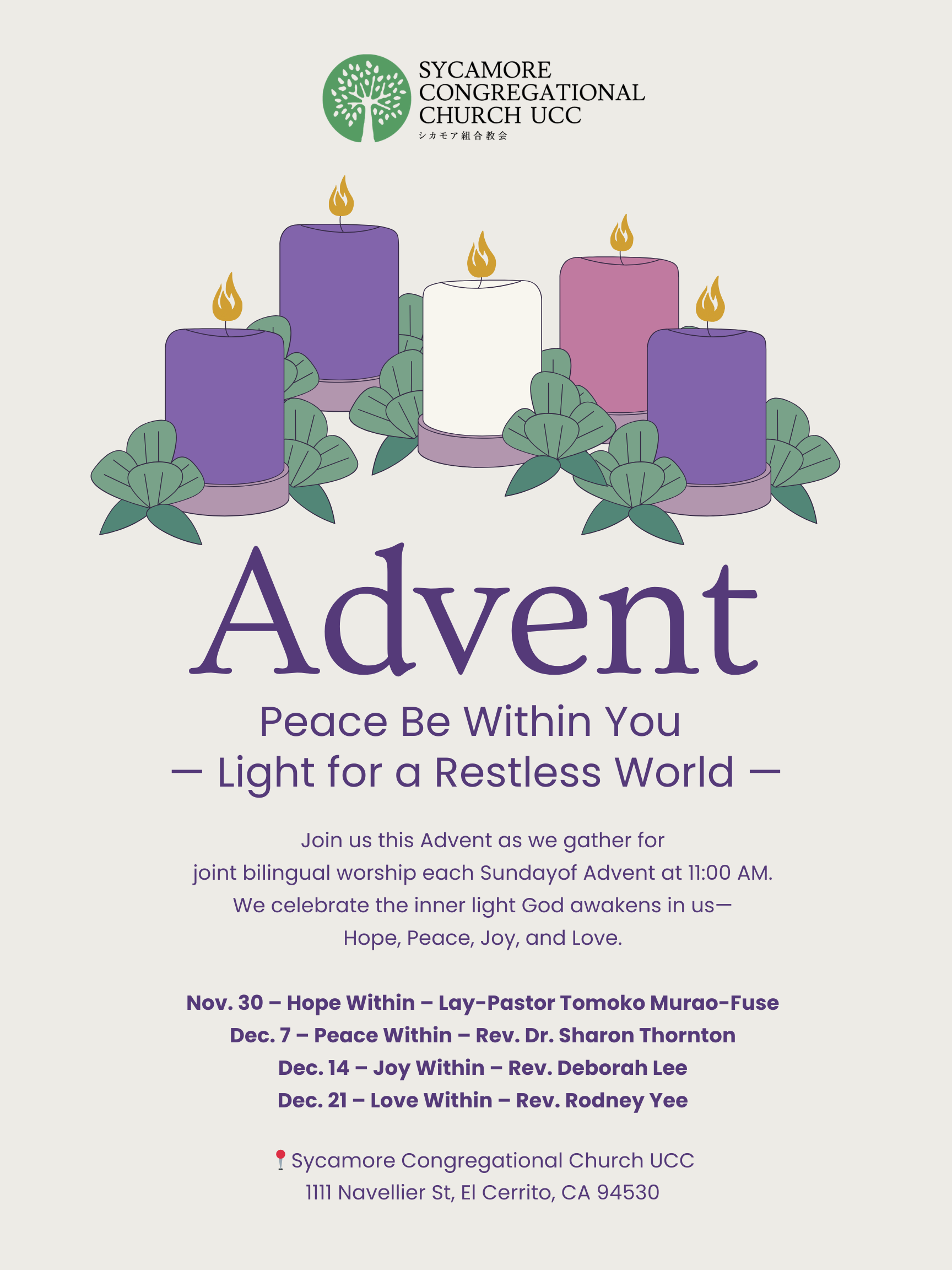 Sycamore is a bilingual Japanese English member of the United Church of Christ (UCC), a progressive Christian denomination. Sycamore has a rich history beginning with its founding by Japanese students in Oakland in 1904. Members experienced the internment camps in the U.S. and hardships during and after World War II. We resettled in El Cerrito in the 1960s and extend our hands of friendship and service to the wider community today.