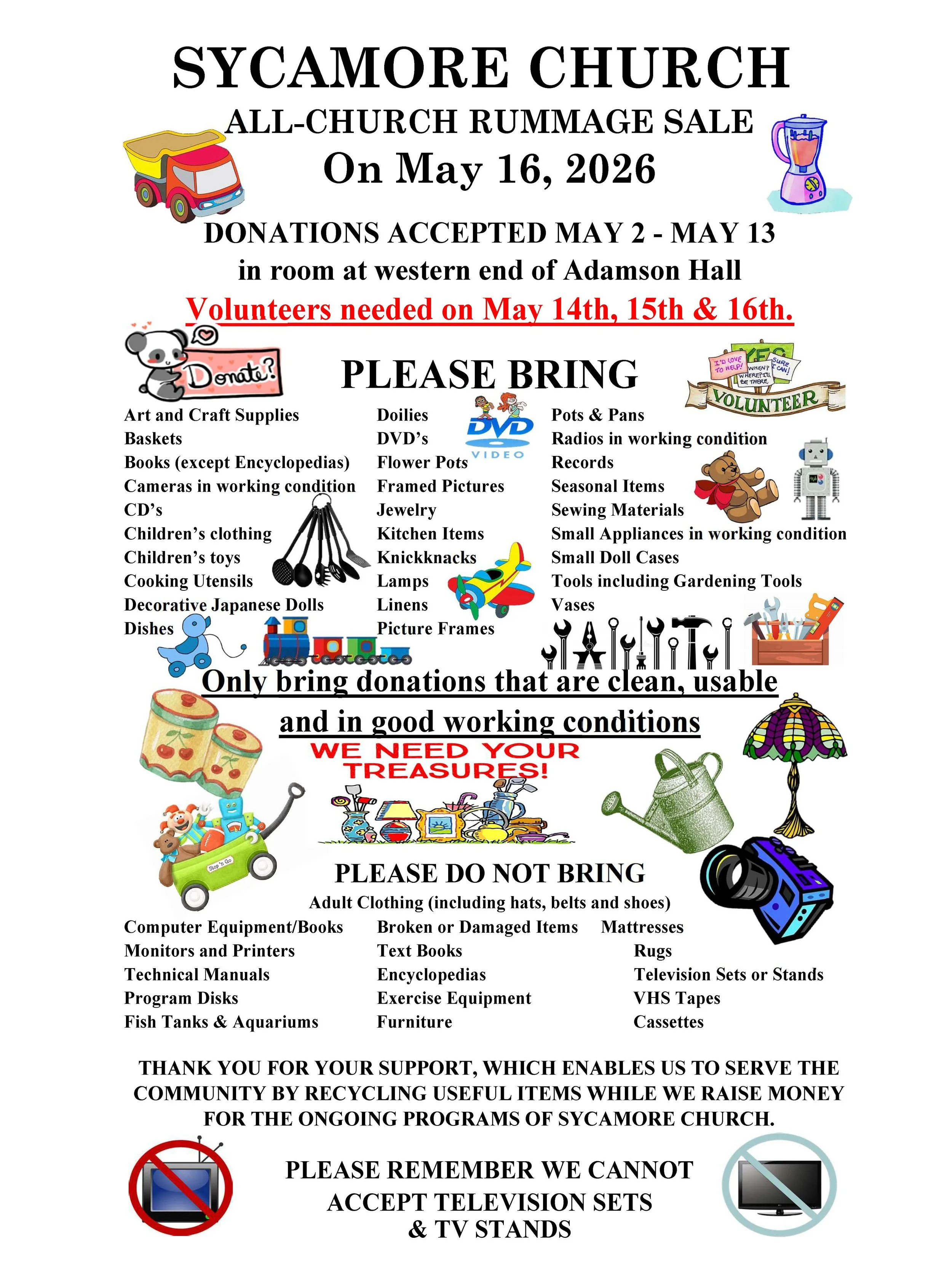 I will be at church to help accept donations between 12pm & 2pm on May 2, 3, 9 & 10. If you bring items during the week feel free to leave donations in the lower parking lot near the gate to the back yard